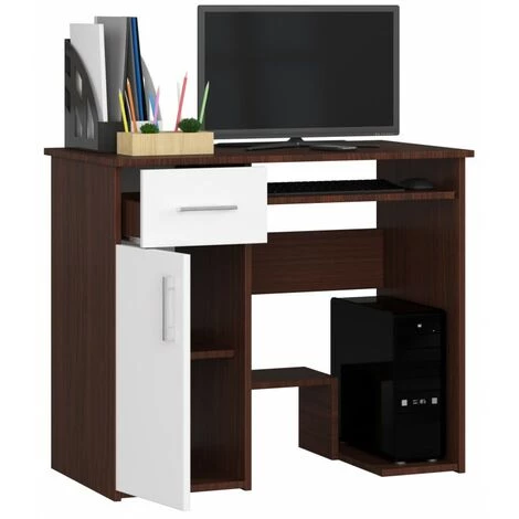 Le bureau est fait en panneau stratifié résistant à l’abrasion. L’armoire fermée et le grand tiroir offrent un espace de rangement important. Le produit est également doté de poignées de tiroir et de porte de couleur argentée, parfaitement assorties à la structure du meuble, et d’une protection supplémentaire des bords protégeant les murs contre les dommages. Corps wengé, façades blanches