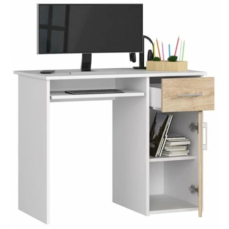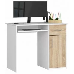 Le bureau est fait en panneau stratifié résistant à l’abrasion. L’armoire fermée et le grand tiroir offrent un espace de rangement important. Le produit est également doté de poignées de tiroir et de porte de couleur argentée, parfaitement assorties à la structure du meuble, et d’une protection supplémentaire des bords protégeant les murs contre les dommages. Corps blanc, façades sonoma