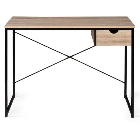 Descriptif du bureau 1 tiroir latéral DETROIT design industrielFaites place au style industriel avec le bureau 1 tiroir DETROIT bi-matière bois et métal. Ses lignes sobres et son style épuré donneront à votre intérieur un aspect loft new-yorkais du plus bel effet !Avec son coloris bois et ses matériaux bruts, votre bureau trouvera facilement sa place chez vous car vous pourrez l’intégrer à différents styles d’intérieurs en renforçant le côté loft ou en donnant un peu de chaleur à son design.Le bureau bois métal industriel est doté d’un long plateau très pratique en particules de bois d’une longueur de 110 cm sur 50 cm de large. Il est idéal pour travailler confortablement, disposer vos pots à crayons, trier vos documents sans gêne et installer votre poste d’ordinateur sur l’espace de travail.Pratique, grâce à son tiroir, avec encoche demi-lune, vous pourrez ranger toutes vos fournitures de bureau et laisser libre votre espace de travail sur le bureau ! Le plateau de 1,5 cm d’épaisseur est soutenu par une solide structure métallique qui assure au bureau solidité et stabilité au quotidien. Le croisillon transversal en métal apporte un renfort supplémentaire au bureau pour une stabilité optimale.Au-delà de son côté authentique et robuste, ses proportions compactes en font un bureau fonctionnel qui pourra s’insérer dans les petits comme les grands espaces de vie.Laissez entrer le style industriel si tendance dans votre intérieur avec notre bureau bi-matière en métal et bois !Pratique et déco, ce meuble modernisera votre salon, chambre ou bureau et facilitera le rangement de votre espace de travail !Dimensions du bureau 1 tiroir latéral DETROIT design industrielDimensions du bureau : Longueur 110 cm x largeur 50 cm x Hauteur 75 cmDimensions du tiroir : Longueur 25,5 cm x Profondeur 28,5 cm x Hauteur 13 cmEpaisseur des panneaux de particules de bois : 1,5 cmA associer par exemple avec nos chaises SAMI.Découvrez également l’ensemble de nos bureaux ainsi que notre collection industrielle sur notre boutique en ligne !