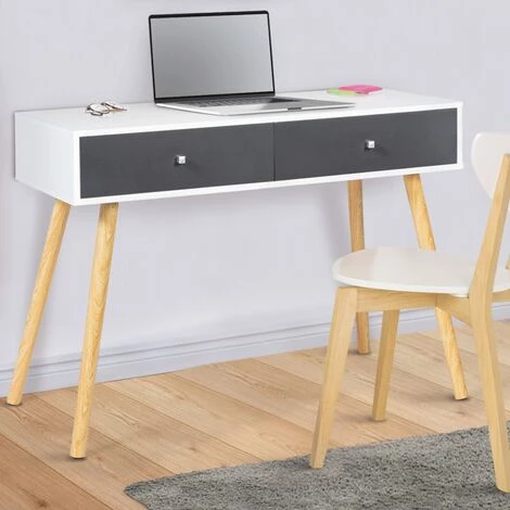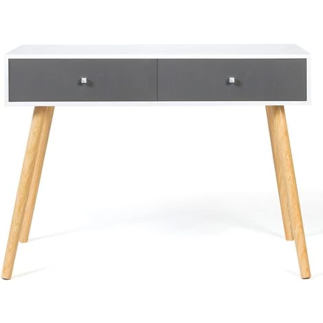 Descriptif du bureau d’appoint console 2 tiroirs EMMIE bois blanc et tiroirs grisSimple et moderne, avec son design sobre et épuré, le bureau d’appoint console d’inspiration nordique EMMIE bois blanc et tiroirs gris s’intègrera parfaitement dans votre pièce de travail, chambre ou bureau.Esthétique, le contraste harmonieux entre la couleur blanche du bureau, ses tiroirs gris au bouton finition argentée et ses pieds en bois clair habillera joliment votre intérieur avec classe et chic.Astucieux et fonctionnels, les 2 tiroirs fermés vous permettront d’organiser votre espace de travail et de ranger vos affaires personnelles en toute discrétion de façon optimisée : livres, fournitures ou encore carnets pour un bureau dégagé !Les dimensions généreuses du plateau d’une longueur de 105 cm sont spécialement conçues pour vous permettre d’y disposer de quoi travailler en toute sérénité : agenda, livres, ordinateur et lampe de bureau.Stables et robustes, ses pieds obliques et fuselés en pin massif au coloris clair lui confèrent une allure élégante et élancée dans un style scandinave très tendance.Pratique et déco, installez-vous confortablement pour travailler ou consulter vos mails.Vous n’avez plus qu’à ajouter une touche pastel, colorée ou graphique pour que votre intérieur soit un véritable cocon !Dimensions du bureau d’appoint console scandinave EMMIEDimensions globales : Longueur 105 x largeur 48 x Hauteur 75 cmDimensions des tiroirs : Longueur 50 x largeur 48 x Hauteur 14 cmMatériaux : Panneaux de particules (épaisseur 1,2 et 1,5 cm) et pieds en boisA monter soi-mêmeModèle également disponible en coloris blanc.Retrouvez l’ensemble de notre collection scandinave sur notre boutique en ligne !