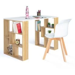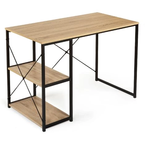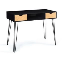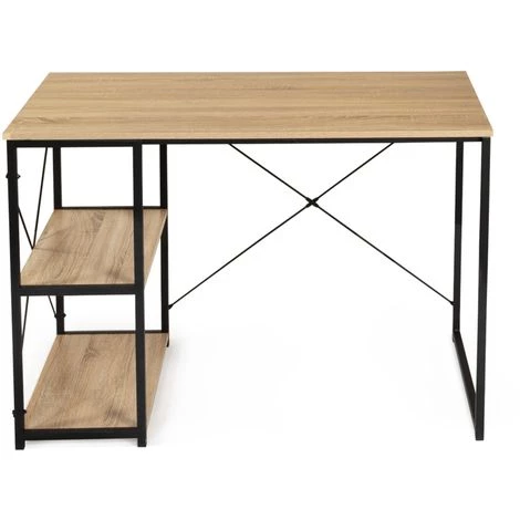 Descriptif du bureau droit DETROIT design industrielLe design du bureau style industriel s’inspire des usines et de leurs ateliers. Les constructions massives et les matériaux bruts caractérisent le monde industriel. Zoom sur l’ADN de bureau industriel pas cher. Les lignes et le style épuré donnent à votre intérieur un aspect loft du meilleur effet. Votre bureau trouve rapidement sa place chez vous car vous pouvez l’intégrer à différents styles d’intérieur en renforçant le côté loft ou au contraire en donnant un peu de chaleur à son design.Le bureau bois métal industriel est doté d’un long plateau très pratique en particules de bois d’une longueur de 110 cm sur 60 cm de large. Il est idéal pour travailler confortablement, disposer vos pots à crayons, trier vos documents sans gêne et installer votre poste d’ordinateur sur le large espace de travail.Fonctionnel, grâce à sa colonne en bois maxi capacité soit 2 étagères, vous pouvez ranger vos livres, classeurs, boîtes de rangement, disposer vos objets de décoration favoris et laisser libre votre espace de travail sur le bureau !Les plateaux de 15 mm d’épaisseur sont soutenus par une solide structure métallique qui vous assure solidité et stabilité au quotidien. Les croisillons transversaux en métal d’une longueur d’1 mètre apportent un renfort supplémentaire à l’étagère pour une stabilité optimale. La haute résistance des matériaux assure à votre bureau une excellente durée de vie.Au-delà de son côté authentique et robuste, ses proportions généreuses en font un bureau fonctionnel qui pourra s’insérer dans les petits comme les grands espaces de vie.Découvrez dès maintenant les finitions particulièrement soignées du bureau industriel droit DETROIT à prix mini.Sublimez votre intérieur avec ses matériaux bruts, ses formes simples et l’alliance du bois et du métal.Laissez entrer le style industriel si tendance dans votre intérieur avec notre bureau bi-matière en métal et bois !Pratique et déco, ce meuble modernisera votre salon ou votre bureau et maximisera le rangement !Dimensions du bureau DETROIT design industrielDimensions totales : Longueur 110 cm x largeur 60 cm x Hauteur 75 cmDimensions des étagères : Longueur 29,8 cm x Profondeur 54 cm x Hauteur 33 cmEpaisseur plateaux bois : 1,5 cmRetrouvez l’ensemble de notre collection industrielle sur notre boutique en ligne !
