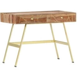 Ce bureau apportera une touche unique à votre intérieur grâce à son design industriel. Vous pouvez l’utiliser comme bureau d’ordinateur pour votre travail quotidien ou en tant que console. Le bureau est fait de bois massif qui est un bois dur tropical qui est célèbre pour ses grains riches et également connu sous le nom de bois de rose ou de palissandre. Les pieds en acier fort contribuent à la solidité du bureau ainsi qu’à son charme industriel. Chaque étape du processus est réalisée avec le plus grand soin, que ce soit le polissage, la peinture ou le laquage. De plus, le bureau a 2 tiroirs avec suffisamment d’espace pour garder vos articles importants organisés et à portée de main. Cet article est facile à assembler. Remarque importante : Les couleurs varient d’une pièce à l’autre, rendant chacun de nos bureaux unique. La livraison est aléatoire.Couleur : bois clair et laitonMatériau : bois solide et acierDimensions : 100 x 55 x 75 cm (L x l x H)Avec 2 tiroirsSurface polie, peinte et laquéeL’assemblage est requisNous ne livrons pas en Corse.
