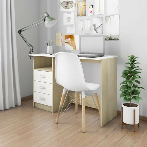 Notre bureau élégant et moderne sera un ajout pratique à votre espace d’étude et de travail ! Fabriqué en aggloméré de qualité, ce bureau d’ordinateur garantit robustesse, durabilité et longue durée de vie. Notre poste de travail est parfait pour tout bureau serré, espace dortoir, maison à espace limité, ou même si vous préférez simplement gérer l’espace dont vous disposez ! Les 3 tiroirs et un compartiment ouvert sur le côté du bureau offrent un grand espace de rangement pour garder vos fournitures d’étude telles que des livres, des dossiers ou d’autres objets utiles à portée de main. De plus, le bureau est facile à nettoyer avec un chiffon humide.Couleur : Blanc et chêne sonomaMatériau : aggloméréDimensions totales : 110 x 50 x 76 cm (l x P x H)Avec 3 tiroirs et un compartiment ouvertFacile à nettoyer à l’aide d’un chiffon humideNous ne livrons pas en Corse.