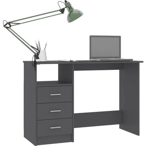 Notre bureau élégant et moderne sera un ajout pratique à votre espace d’étude et de travail ! Fabriqué en aggloméré de qualité, ce bureau d’ordinateur garantit robustesse, durabilité et longue durée de vie. Notre poste de travail est parfait pour tout bureau serré, espace dortoir, maison à espace limité, ou même si vous préférez simplement gérer l’espace dont vous disposez ! Les 3 tiroirs et un compartiment ouvert sur le côté du bureau offrent un grand espace de rangement pour garder vos fournitures d’étude telles que des livres, des dossiers ou d’autres objets utiles à portée de main. De plus, le bureau est facile à nettoyer avec un chiffon humide.Couleur : grisMatériau : aggloméréDimensions totales : 110 x 50 x 76 cm (l x P x H)Avec 3 tiroirs et un compartiment ouvertFacile à nettoyer à l’aide d’un chiffon humideNous ne livrons pas en Corse.