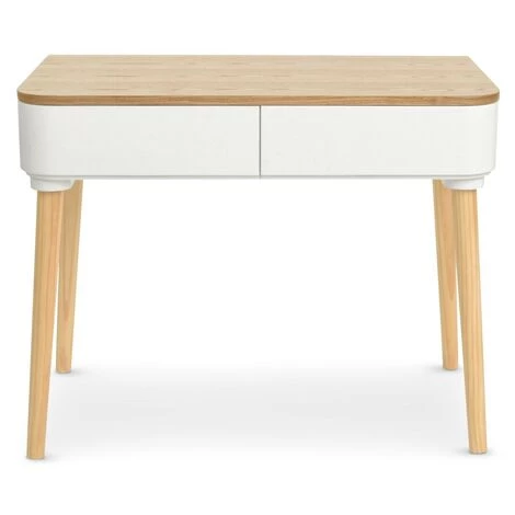 Beau bureau de la collection Skondu au design épuré qui conviendra à tous les intérieurs contemporainsSon coloris bois ainsi que ses quatre pieds légèrement de biais lui confèrent un look particulièrement à la mode. Il est équipé de deux tiroirs L 95 x P 50 x H 76 cmNous ne livrons pas en Corse.
