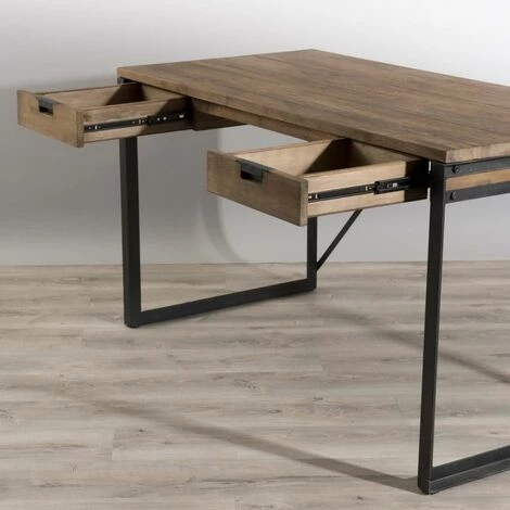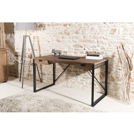 Bureau 2 tiroirs teck recyclé métal noir. Dimensions : 140 x 70 x 78 cm. Article en Teck recyclé et Métal. Cet article est composé de bois recyclé ! Le bois recyclé est un bois récupéré de vieilles charpentes, de coques de bateaux ou tout bois de récupération ayant déjà eu une longue vie. C’est ce qui lui donne cet aspect vieilli et authentique avec ses imperfections qui font tout son charme. Acquérir du bois recyclé est une initiative écoresponsable qui permet de lutter contre la déforestation. Meuble monté, pieds à visser
