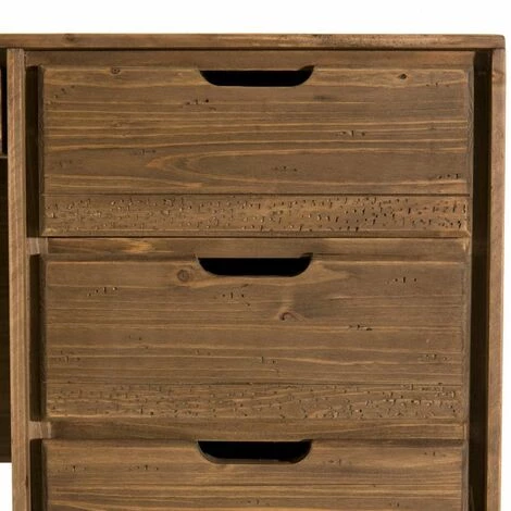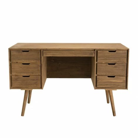 Bureau scandi bois marron 6 tiroirs Sapin . Dimensions : 128 x 57 x 77 cm . Article en Sapin et Fonds de tiroirs en contreplaqué. Ce joli bureau en bois de sapin ciré apportera un véritable charme à votre pièce et vous rapprochera de la nature grâce à son aspect cannelle vieillie. Il s’agit du mobilier idéal pour créer un espace de travail agréable et chaleureux au sein de votre maison. Il révèle un certain côté authentique qui rendra cet endroit atypique. Osez l’accorder avec des éléments de décoration « tape à l’œil » afin qu’il soit mis en valeur. L’aspect brut de ce bois vous fera voyager au cœur de la Scandinavie et s’accordera merveilleusement avec votre décoration. Meuble monté, pieds à visser