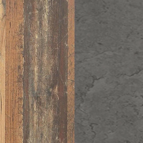 - COMPOSITION : Structure en panneaux de particules en moyen 1,5 cm d’épaisseur. Revêtement papier décor bois vieilli et béton gris foncé. Panneaux arrière en HDF. Poignées en plastique noir.