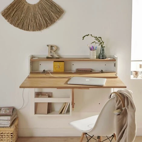 La plage de dépose sur le caisson est équipée d’un passe-câbles de chaque côté pour relier et organiser tous vos appareils multimédias. Le plateau peut soutenir une charge de 20 kg maximum. L’équerre du plateau en blanc laqué satiné et le caisson sont en medium (MDF) 18 mm. Les plateaux et le caisson de rangement sont en medium (MDF) 18 mm avec un placage frêne. Ce bureau mural est préalablement assemblé, vous n’avez plus qu’à le fixer au mur.