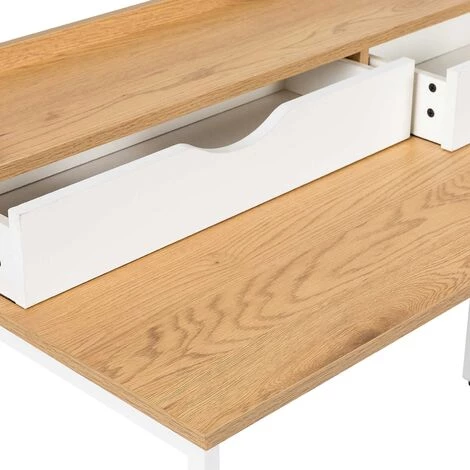 Le bureau console KRISTOFER est équipé d’un plateau en bois MDF couleur chêne, rehaussé par une étagère avec deux tiroirs. Idéal pour ranger vos stylos, livres et fournitures à portée de main tout en gardant votre espace de travail toujours bien agencé.