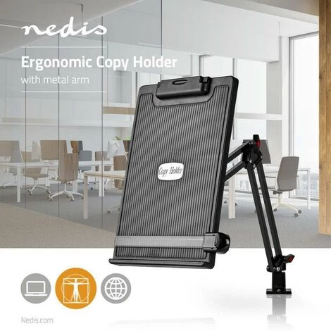 Ce porte-copie Nedis® peut facilement se visser à n’importe quel bureau pour réduire la pression sur les muscles du cou lorsque vous consultez des informations sur papier. Il peut être positionné exactement là où vous en avez besoin grâce à son bras réglable et à son clip de fixation.