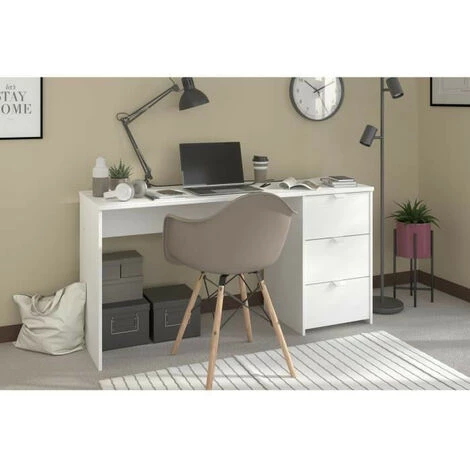 Bureau 3 tiroirs, dessus long 150 cm avec passe câbles, en panneau de particules revetu papier décor blanc, D LXHXP: 150 X 75X49.5