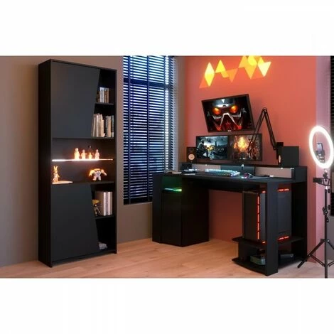 GAMING ENSEMBLE BUREAU GAMER avec large zone de jeu, une réhausse pour écrans, un espace ouvert pour unité centrale, ruban leds avec télécommande et une BIBLIOTHEQUE , 5 tablettes dont une tablette verre, ruban leds avec télécommande, 2 portes avec plusieurs sens de montage possibles – En panneau de particules revetu papier décor Noir – Dimensions du Bureau : LXHXP: 152×86,7×61,5 cm – Dimensions de la Bibliotheque: