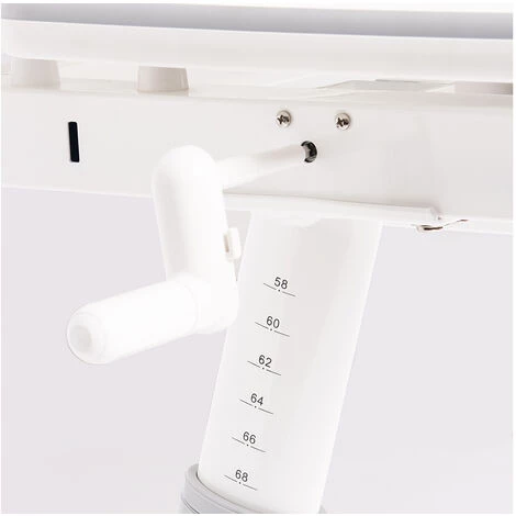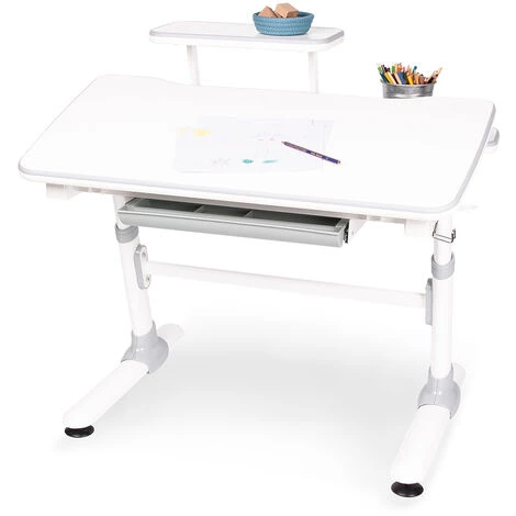 Bureau pour enfants « Liam », avec un plateau réglable en hauteur, 1 tiroir, 1 plan de travail amovible, 1 crochet pour les sacs. Décor : uni, blanc et gris et métal, laqué blanc. Dimensions L 98 x P 72 x H 58 à 80 cm. Le plateau de la table est réglable en hauteur en continu à l’aide d’une manivelle, pour une position assise confortable. Le grand plan de travail de 98 x 50 cm est mobile et peut être incliné jusqu’à 25 degrés. Le petit plan de travail de 98 x 22 cm est. Grâce au tiroir avec sa division pratique, les cahiers, stylos et autres ustensiles d’écriture peuvent être rangés sans problème et sont rapidement à portée de main pour les devoirs et l’apprentissage. Les sacs peuvent être facilement accrochés au crochet. Les pieds réglables garantissent une bonne tenue du bureau, même sur un sol irrégulier. 2 roulettes permettent de déplacer rapidement et facilement le bureau à l’endroit souhaité.
