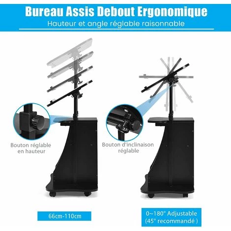 RELAX4LIFE Bureau Assis Debout Mobile Hauteur Réglable 66-110CM Avec Compartiment, Bureau D’Ordinateur Inclinable à 180° Avec Étagère Pour Conférence Réunion Bureau