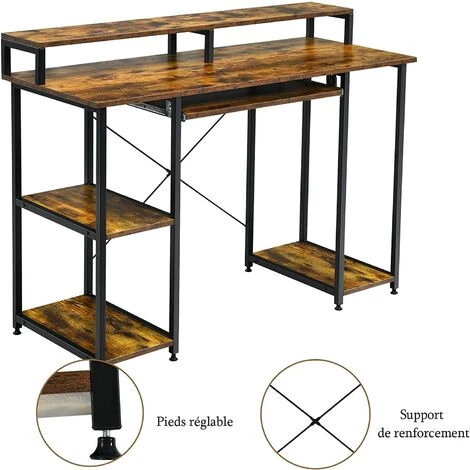 Le bureau d’ordinateur en panneau de particules est robuste et solide. Le cadre en acier renforce la stabilité et peut supporter jusqu’à 100 kg. Équipé de 1 bureau spacieux, 1 plateau de clavier, 1 stand des hôtes informatiques et étagères à 2 niveaux, vous pouvez placer des ordinateurs, des claviers et d’autres articles. De plus, les pieds réglables vous permettent d’équilibrer la table sur un sol inégal. Cette table peut être utilisée comme bureau d’ordinateur, table d’étude et table de jeu.