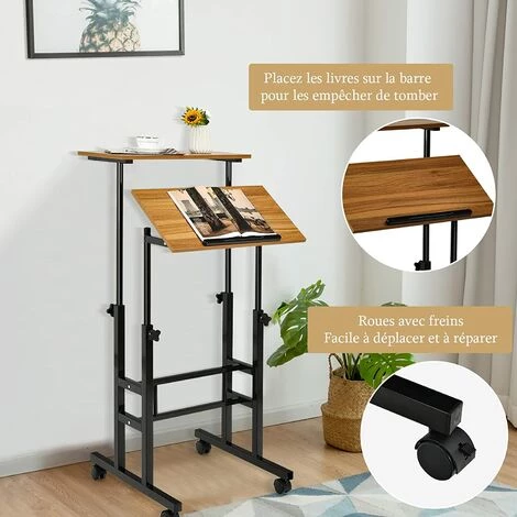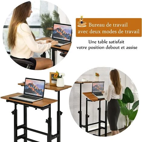 RELAX4LIFE Bureau D’Ordinateur Réglable En Hauteur Et Angle, Bureau Assis-Debout Avec 2 Tablettes, 4 Roulettes Et Bande Antidérapante, Table D’Ordinateur Pour Bureau, Chambre Et Salon (Noyer)