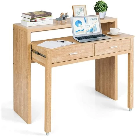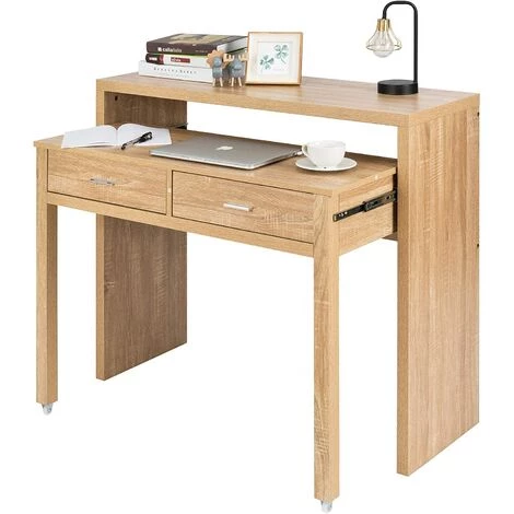 RELAX4LIFE Table D’ordinateur Bureau à Rallonges Avec 2 Plateaux Et 2 Tiroirs, Console Extensible Avec Roulettes Pour Salon, Salle D’Étude, 100x36x88cm
