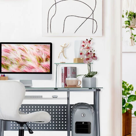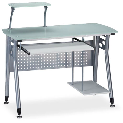 Cette table de bureau vous donne non seulement de l’espace pour votre ordinateur et imprimante, mais aussi pour votre clavier qui est sous la table sur le plateau coulissant. A la maison dans votre chambre de travail ou dans une chambre d’ado ou au travail dans votre bureau, la table de verre est la place de travail idéale dans un design moderne. Posez votre ordinateur dans le compartiment ouvert sous la table et créez ainsi un espace de travail bien ordonné. En outre la petite étagère sur la table peut être déplacée vers la droite ou vers la gauche
