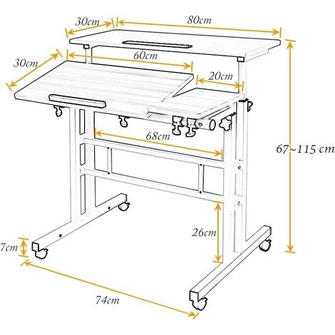Bureau debout DIMENTIONS– 80L x 60W cm, hauteur réglable de 67 à 115cm; Poids: 11kg. SANS le support d’ordinateur hôte