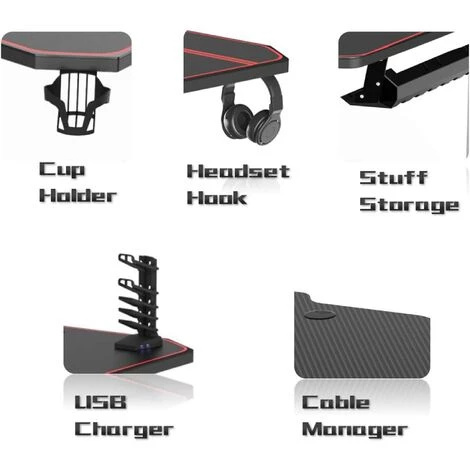 Bureau de Jeu Table de Jeu Multifonctionnel pour les joueurs E-Sports Ce bureau de jeu est livré avec un support de poignée de jeu USB, un grand tapis de souris couvrant tout le bureau, un crochet pour casque et un porte-gobelet. Avec ses pieds robustes en forme de T et ses coussinets en nylon anti-rayures, le bureau de jeu est plus durable et plus stable.