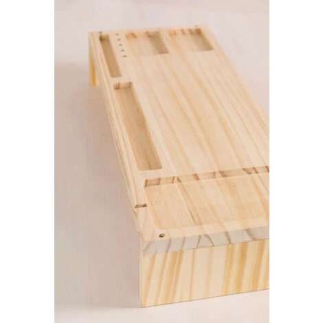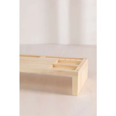 Nous vous présentons le Support d’Écran avec organiseur de Bureau Lescun, fabriqué en bois de pin résistant et robuste avec une finition vernie. C’est le complément parfait pour maintenir une bonne position pendant les heures de travail et éviter les maux de cou ou de dos, grâce au fait qu’il permet de placer le moniteur à la bonne hauteur. Lescun présente un design fonctionnel et original avec plusieurs compartiments de différentes tailles, qui vous permettent de garder votre bureau bien rangé, offrant une touche simple et agréable.Pour un bon entretien, nous vous recommandons de le nettoyer avec un chiffon humide, en évitant l’utilisation de produits chimiques. Dimensions (Hauteur x Largeur x Profondeur): 8,7 cm x 55 cm x 19,7 cm IMPORTANT : Le service standard porte-à-porte ne comprend pas la livraison et la collecte des marchandises au domicile du client, qui sont à la charge de ce dernier. Il est possible que le livreur aide volontairement à la livraison de la marchandise (ceci est totalement volontaire pour le livreur et la société de transport et ne relève pas de la responsabilité de Sklum).L’assemblage n’est pas non plus inclus.