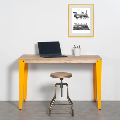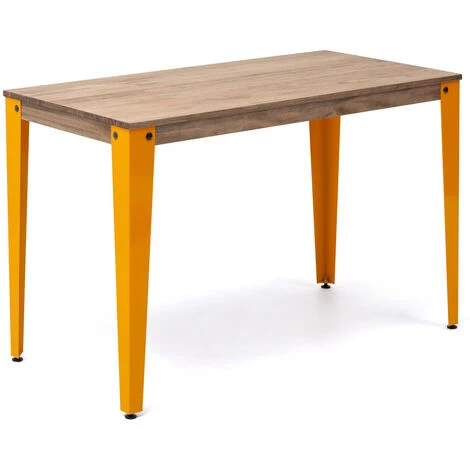Table de bureau ou salle à manger en style industriel vintage. Longueur 120cm x Profondeur 60cm x hauteur de 75cm. Métal Jaune, bois finition vieilli “effect vintage”. Conçue et fabriqué en Espagne par BOX FURNITURE.Parfaite pour créer une ambiance industrielle. Le style de mobilier industriel vintage prend ses caractéristiques des vieilles usines ou espaces industriels, auxquels des solides pièces en bois massif sont combinées avec des éléments metalliques qui font l’union et au même temps leur confèrent une extraordinaire résistance à l’usage. Plateau en bois massif de pin fini avec des huiles naturels, avec haute résistance à l’usage et certification écologique. Touchée très agréable à bois naturel. Très solide avec pieds métal en 2 mm. d’épaisseur coupé à laser. Finition avec peinture en poudre sechée au four à l’haute température.Chaque pièce est unique et legères variations de tonalité peuvent apparaître par rapport à la photo. On peut avoir des petites variations en mesures à cause de changements des matières premières (+-1 cm.). Meuble recommandé pour intérieur. Envoyé démonté. Livré avec notice de montage, vis et tous les éléments pour l’assemblage. Conseillé d’utilisser un tournevis éléctrique.