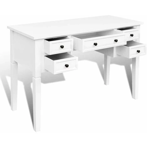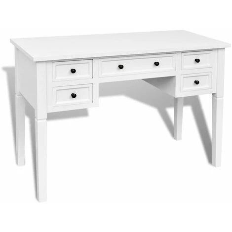 Ce bureau doté d’un design simple mais intemporel, ajoutera une touche romantique à votre bureau ou chambre. Ce bureau durable comporte cinq grands tiroirs à papeterie offrant assez d’espace pour stocker et organiser vos fichiers, papiers, documents et autres fournitures de bureau. Le bureau offre également suffisamment d’espace pour vos ornements ou autres effets personnels. Ce solide bureau peint en blanc est construit en MDF et en pin de haute qualité.