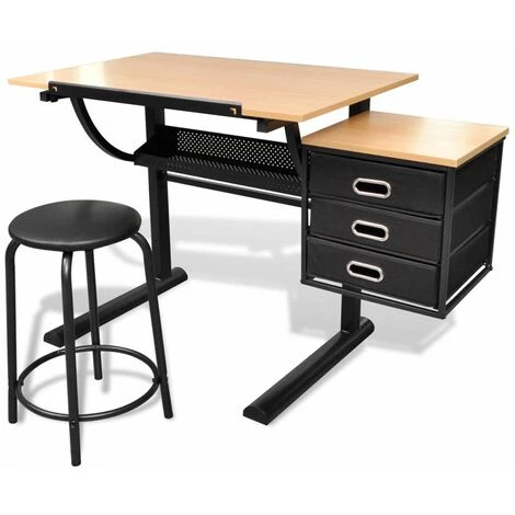 Cette table à dessin, dotée d’un espace de travail confortable, sera absolument d’une grande aide pour votre dessin, votre écriture, etc. Cette table de haute qualité, avec dessus de table inclinable, offre beaucoup d’espace de travail, ce qui la rend parfaitement adaptée à l’étude et au dessin technique. La butée de feuille garde le papier sur la table tandis que le dessus est incliné. Notre table d’écriture possède également trois tiroirs coulissants pour un rangement supplémentaire. Le tabouret inclus est épaississement rembourré pour vous mettre à l’aise pendant le travail. La table est fabriquée en MDF de haute qualité et soutenue par des pieds en fer enduit de poudre pour la durabilité, qui vous servira sûrement de nombreuses années.