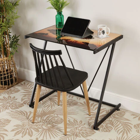 - CARACTÉRISTIQUES – La bureau meuble Versa a la taille parfaite pour la chambre, le bureau ou le studio. La table a une hauteur de 76 cm, une longueur (profondeur) de 51 cm, et una largeur (d’un côté à l’autre) de 76 cm. Le poids est de 5,7 kg et est fabriqué en Pieds en métal et plateau en verre trempé. Coleur: plan de travail avec motifs safari et cadre noir.