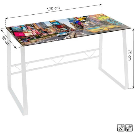- Bureau en verre trempé (Cristal) et métal se mariera en toutes neutralité dans votre maison. Le bureau est composé d’un plateau en verre de sécurité trempé résistant et durable et de pieds carrés en métal tubulaire en fer, laqués en blanc mat. Une table d’ordinateur polyvalente, pratique et fonctionnelle, au style moderne, que vous pouvez intégrer dans n’importe quelle pièce, quel que soit son style. Le plateau en verre trempé du bureau est photo imprimé avec un paysage new-yorkais en couleur de Times Square à Manhattan.